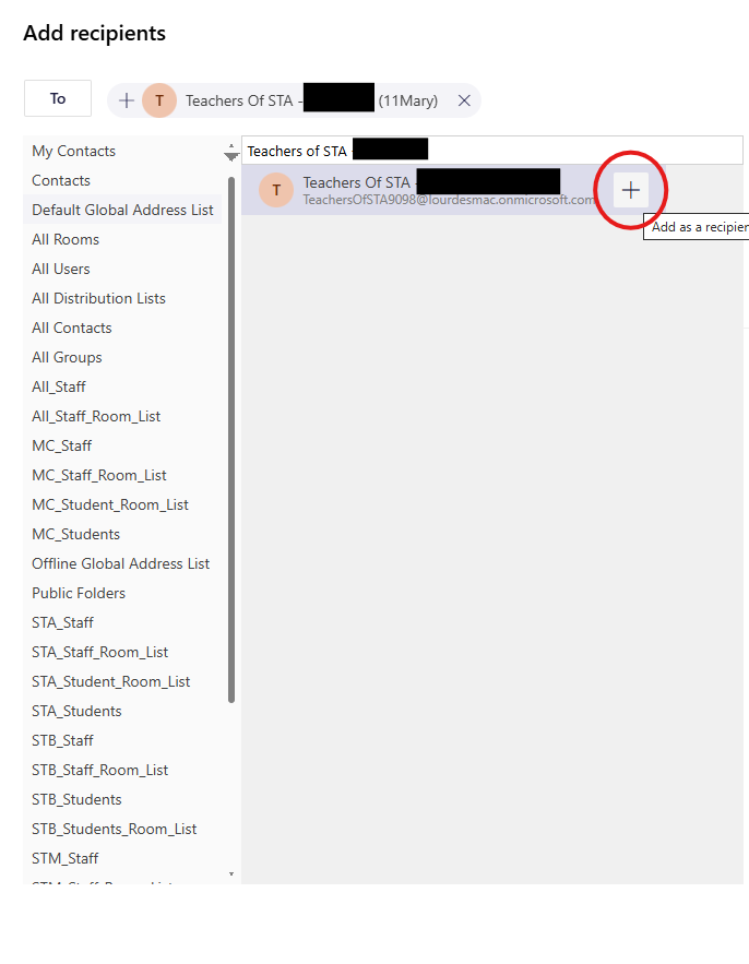 - Next click on either Default Global Address List (for groups), or the specific group for your school (for example STA_Students.